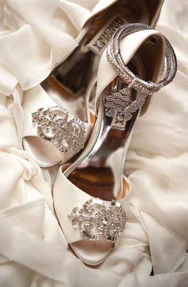 The bride wore a Reem Acra-designed dress, with crystal encrusted cap