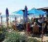 flooring, firepits, glass windscreen, and sails draping overhead.