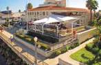flooring, firepits, glass windscreen, and sails draping overhead.