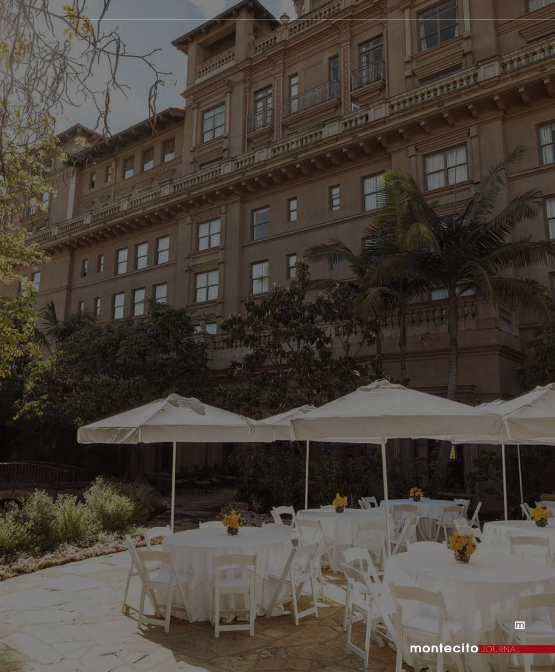 a symmetrical red-roofed building, all framed against the San Gabriel Mountains. Inside, a formal-yet-comfortable